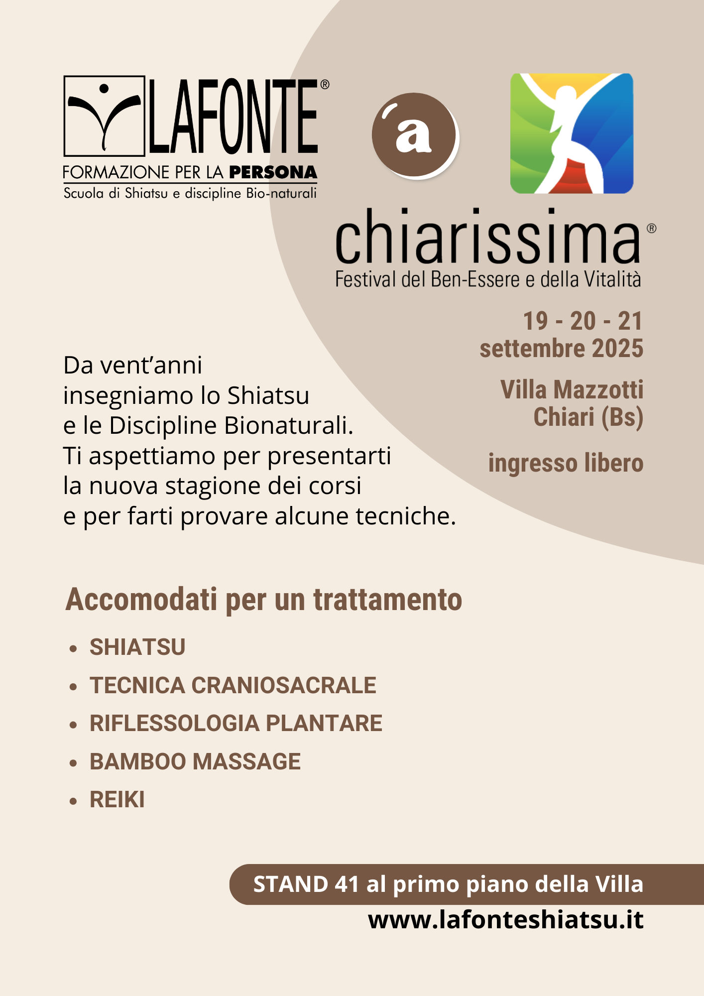Un nuovo scenario accoglie i trattamenti promozionali della scuola LAFONTE di Bergamo prima dell’avvio della nuova stagione dei corsi di Shiatsu e Discipline bionaturali: il Festival Chiarissima, in programma da venerdì 19 a domenica 21 settembre nel parco e nelle sale della novecentesca Villa Mazzotti a Chiari (Bs).